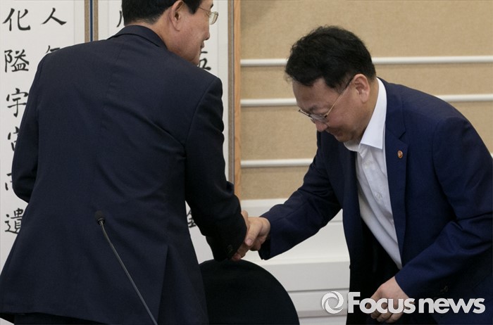 (서울=포커스뉴스) 13일 오전 서울 여의도 국회 귀빈식당에서 열린 더불어민주당 저출산 해소를 위한 국민연금 공공투자 특별위원회 1차 정책협의회에 참석한 변재일(왼쪽) 정책위의장과 유일호 경제부총리 겸 기획재정부 장관이 인사하고 있다.