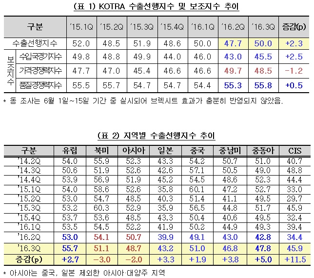코트라는 14일 '2016년 3분기 KOTRA 수출선행지수(이하 수출선행지수)'를 발표한다며 이같이 밝혔다. 이번 보고서는 지난달 1일부터 15일까지 진행한 설문조사를 토대로 작성됐으며 전세계 해외 바이어 및 주재상사 직원 약 2200명이 참여했다.