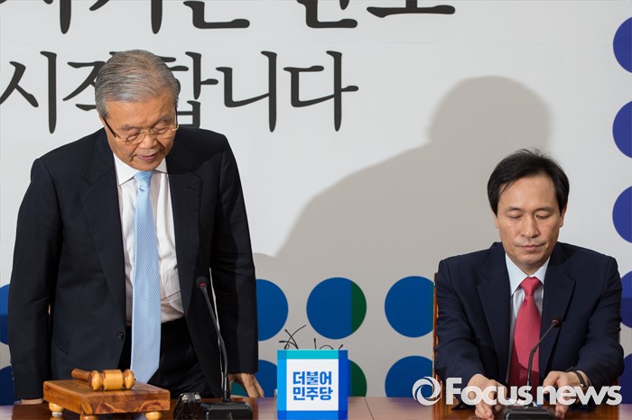 (서울=포커스뉴스) 김종인(왼쪽) 더불어민주당 비상대책위 대표와 우상호 원내대표가 13일 오전 서울 여의도 국회에서 열린 비상대책위원회의에 참석해 시작 전 준비 하고 있다.