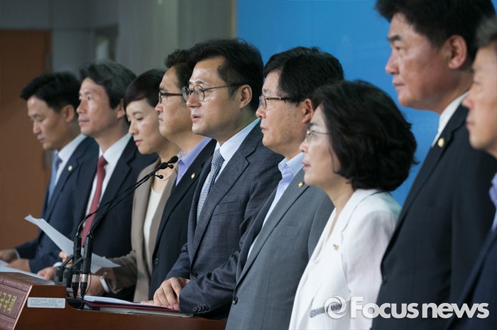 (서울=포커스뉴스) 13일 오전 서울 여의도 국회 정론관에서 더불어민주당 민주평화국민연대(이하 민평련) 소속 의원들이 한반도 및 동북아지역의 평화와 협력을 위협하는 사드배치 반대 기자회견을 하고 있다.