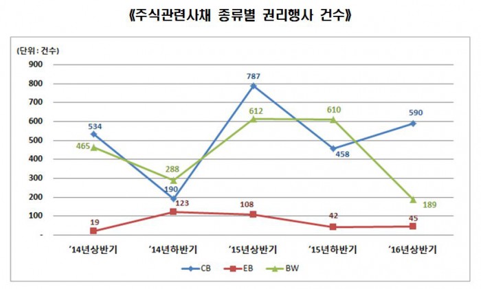 종류별로는 전환사채가 직전 반기 대비 28.8% 증가한 590건, 교환사채는 7.1% 증가한 45건, 신주인수권부사채는 69% 감소한 189건을 기록했다.<자료=한국예탁결제원>