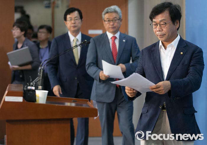 (서울=포커스뉴스) 13일 오전 서울 여의도 국회 정론관에서 이완영(경북 고령·성주·칠곡, 오른쪽) 새누리당 의원과 이만희(왼쪽), 이철우 의원이 사드 대구 및 경북지역 사드배치와 관련 항의 기자회견을 위해 입장하고 있다.