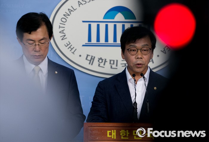 (서울=포커스뉴스) 13일 오전 서울 여의도 국회 정론관에서 이완영(경북 고령·성주·칠곡, 오른쪽) 새누리당 의원과 이만희 의원이 사드 대구 및 경북지역 사드배치와 관련 항의 기자회견을 하고 있다.