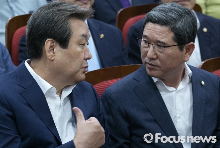 (서울=포커스뉴스) 13일 오전 서울 여의도 국회 의원회관에서 열린 대한민국 미래혁신포럼 창립기념 특강에 참석한 김무성(왼쪽) 새누리당 전 대표와 김학용 의원이 대화하고 있다.
