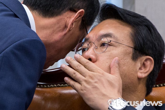 (서울=포커스뉴스) 국회 운영위원회 위원장인 정진석(오른쪽) 새누리당 원내대표와 새누리당 간사인 김도읍 원내수석부대표가 13일 오전 서울 여의도 국회에서 열린 '운영위원회 전체회의'에 참석해 대화 하고 있다.