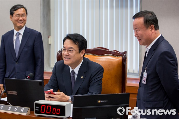(서울=포커스뉴스) 국회 운영위원회 위원장인 정진석(가운데) 새누리당 원내대표와 김재원(오른쪽) 대통령비서실 정무수석이 13일 오전 서울 여의도 국회에서 열린 '운영위원회 전체회의'에 참석해 대화 하고 있다.