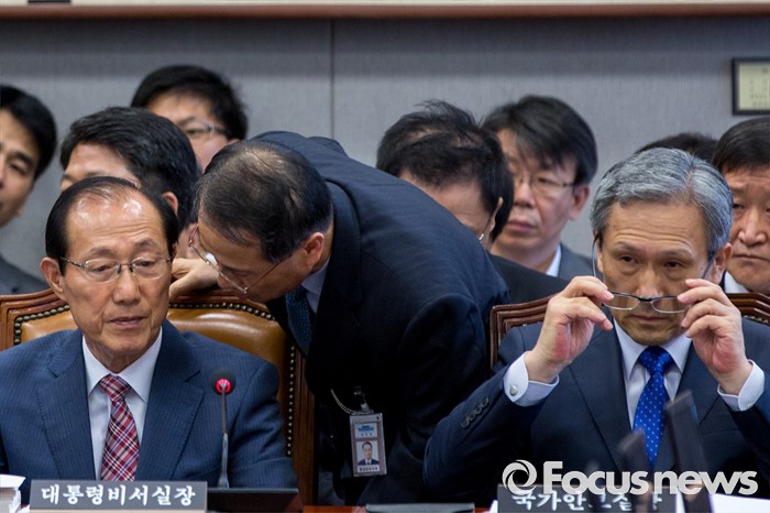 (서울=포커스뉴스) 이원종(왼쪽) 대통령비서실 비서실장과 김규현(가운데) 외교안보수석이 13일 오전 서울 여의도 국회에서 열린 '운영위원회 전체회의'에 참석해 대화 하고 있다. 사진 오른쪽은 김관진 국가안보실장.