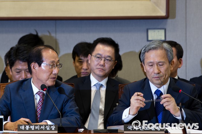 (서울=포커스뉴스) 이원종(왼쪽) 대통령비서실 비서실장과 김관진 국가안보실장이 13일 오전 서울 여의도 국회에서 열린 '운영위원회 전체회의'에 참석해 대화 하고 있다.