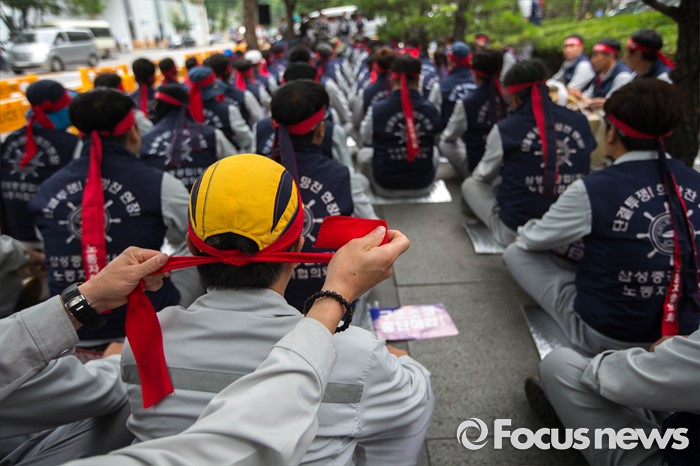 (서울=포커스뉴스) 13일 오전 서울 여의도 산업은행 본점 앞에서 삼성중공업 노동자협의회 관계자들이 고용안정 요구 및 정부의 조선업 구조조정을 규탄하는 상경 집회를 하고 있다.