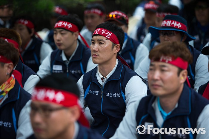 (서울=포커스뉴스) 13일 오전 서울 여의도 산업은행 본점 앞에서 삼성중공업 노동자협의회 관계자들이 고용안정 요구 및 정부의 조선업 구조조정을 규탄하는 상경 집회를 하고 있다.