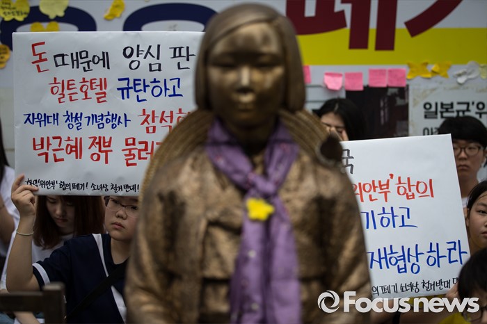 (서울=포커스뉴스) 자위대 창설 62주년 기념행사가 서울 한복판에서 열리고 하루가 지난 13일 오후, 서울 종로구 주한일본대사관 앞에서 일본군 '위안부' 문제 해결을 위한 제1239차 정기 수요집회가 열리고 있다.