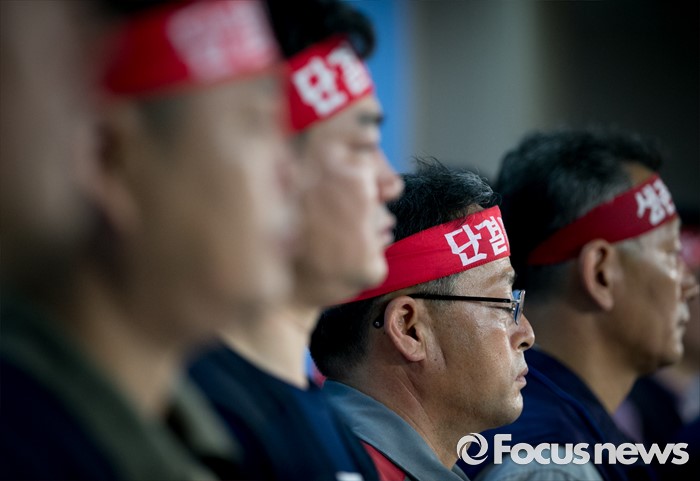 (서울=포커스뉴스) 13일 오전 서울 여의도 국회 정론관에서 조선업종노조연대 등 관계자들이 일방적 구조조정에 반대하는 총파업 선언 기자회견을 하고 있다.