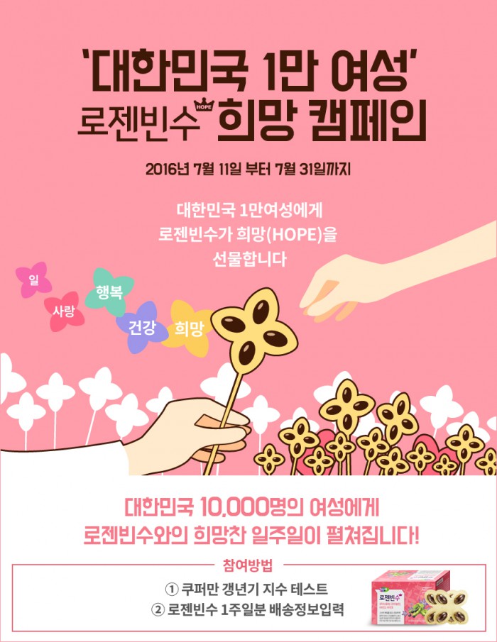 이번 캠페인은 '쿠퍼만 갱년기 지수' 테스트를 진행하면 총 1만명에게 여성 전문건강기능식품 '로젠빈수'를 증정하는 행사다.