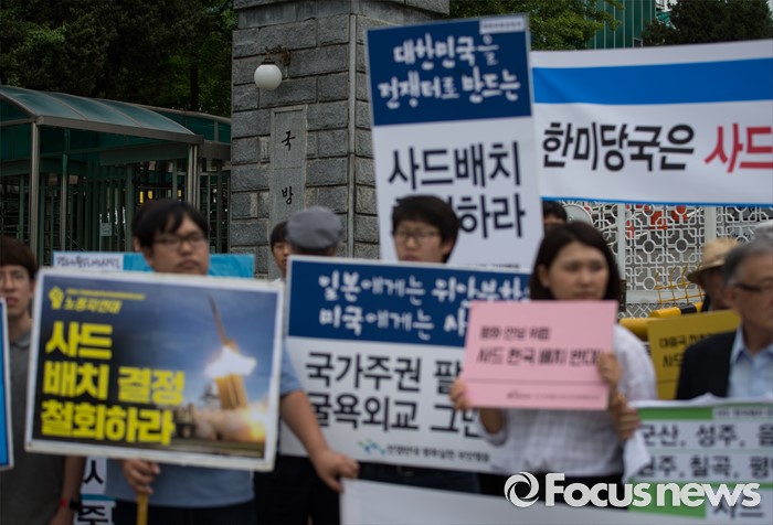 (서울=포커스뉴스) 국방부에서 주한미군 고고도 미사일 방어 체계 사드(THAAD) 배치 지역을 성주로 결정하고 공식 발표를 앞둔 13일 오후, 평통사 관계자 및 시민들이 서울 용산구 국방부 앞에서 정부를 규탄하는 시위를 하고 있다.