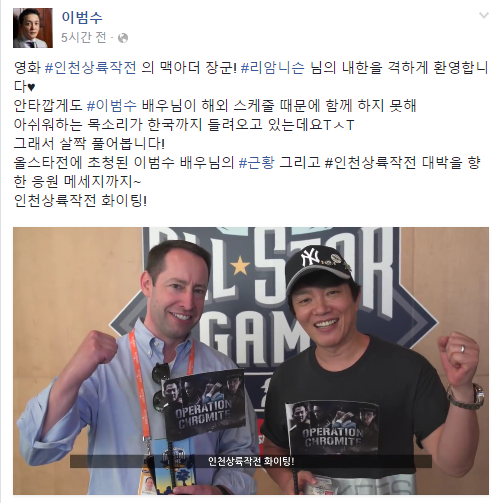 이범수가 글과 함께 공개한 영상에는 이범수가 메이저리그 관계자와 함께 영화 '인천상륙작전'의 흥행을 기원하는 모습이 담겼다.
