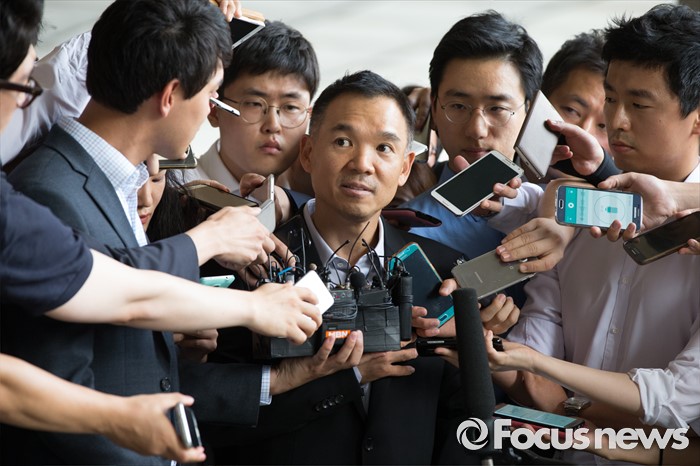(서울=포커스뉴스) 진경준 검사장의 '주식대박' 의혹과 관련해 넥슨 창업주 김정주 NXC(넥슨지주회사) 회장이 13일 오후 서울 서초구 서울중앙지방검찰청으로 들어서기 전 취재진의 질문을 받고 있다.