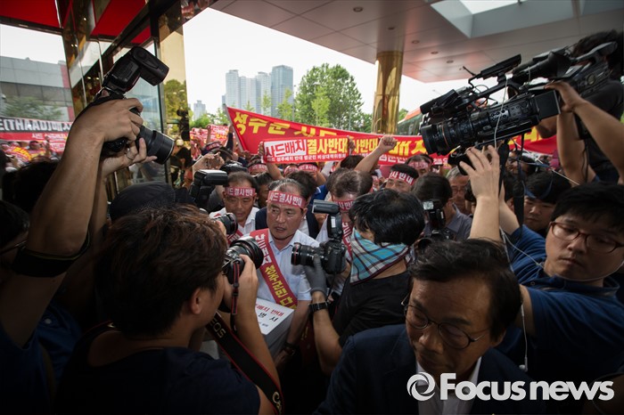 (서울=포커스뉴스) 13일 오후 서울 용산구 국방부를 찾은 성주 군수와 군민들이 사드배치 반대 성명서를 전달하기 위해 국방컨벤션을 들어서고 있다. 이날 국방부에서 주한미군 고고도 미사일 방어 체계 사드(THAAD) 배치 지역을 성주로 결정하고 공식 발표했다.