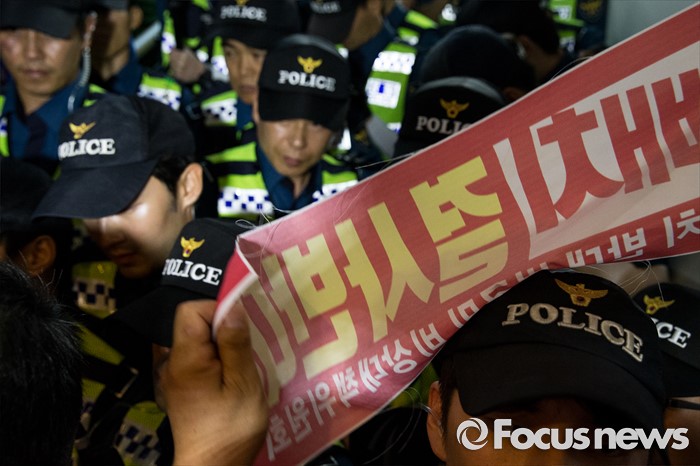 (서울=포커스뉴스) 국방부가 사드 배치 지역을 경북 성주로 확정 지은 13일 오후 서울 용산구 국방컨벤션에서 성주군민들이 군수와 국방부 관계자 면담자리에 진입을 시도하고 있다.