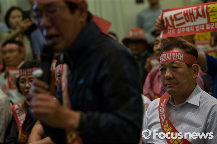 (서울=포커스뉴스) 13일 오후 서울 용산구 국방컨벤션을 찾은 김항곤(오른쪽) 성주군수와 군민들이 국방부를 상대로 항의하고 있다. 이날 국방부에서 주한미군 고고도 미사일 방어 체계 사드(THAAD) 배치 지역을 성주로 결정하고 공식 발표했다.