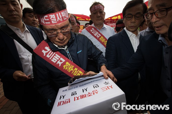 (서울=포커스뉴스) 13일 오후 서울 용산구 국방부를 찾은 성주 군수와 군민들이 사드배치 반대 성명서를 전달하기 위해 국방컨벤션을 들어서고 있다. 이날 국방부에서 주한미군 고고도 미사일 방어 체계 사드(THAAD) 배치 지역을 성주로 결정하고 공식 발표했다.