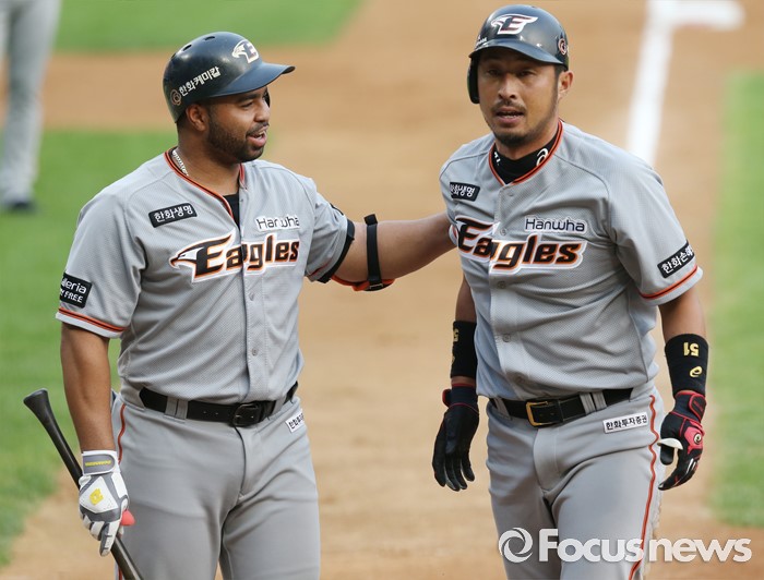 (서울=포커스뉴스) 13일 서울 잠실구장에서 열린 2016 프로야구 한화-LG 경기 1회초 2사 2,3루에서 중견수앞 3루타를 치고 홈에서 아웃된 김경언을 로사리오가 격려하고 있다.