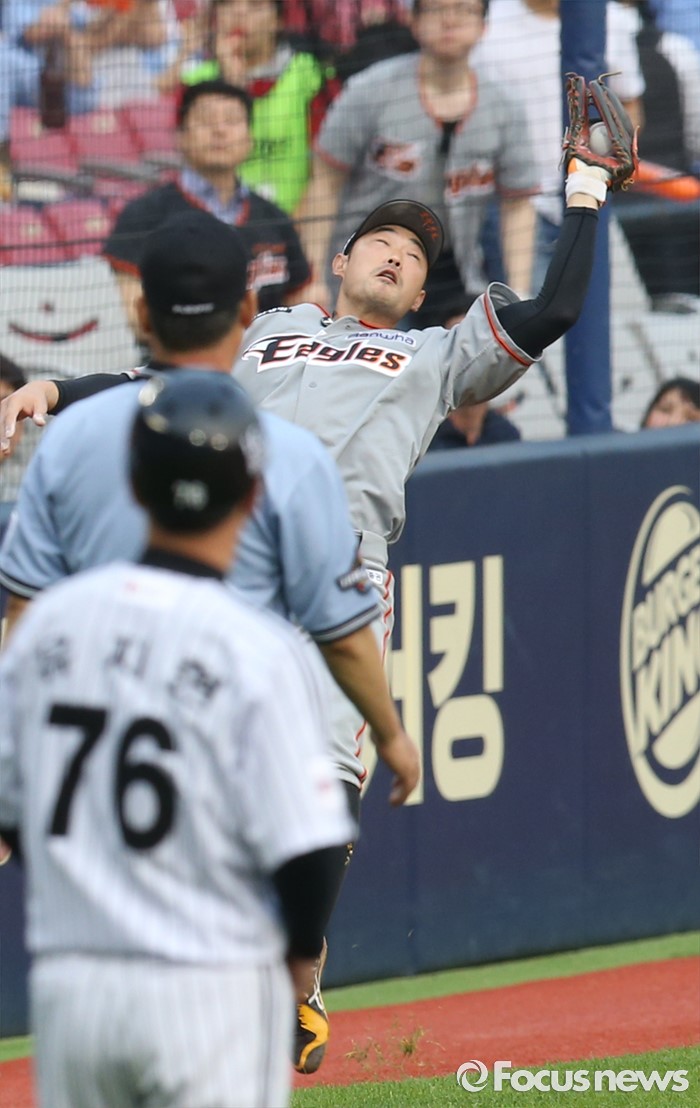 (서울=포커스뉴스) 13일 서울 잠실구장에서 열린 2016 프로야구 한화-LG 경기에서 1회말 한화 3루수 송광민이 LG 박용택의 파울플라이 볼을 잡고 있다.