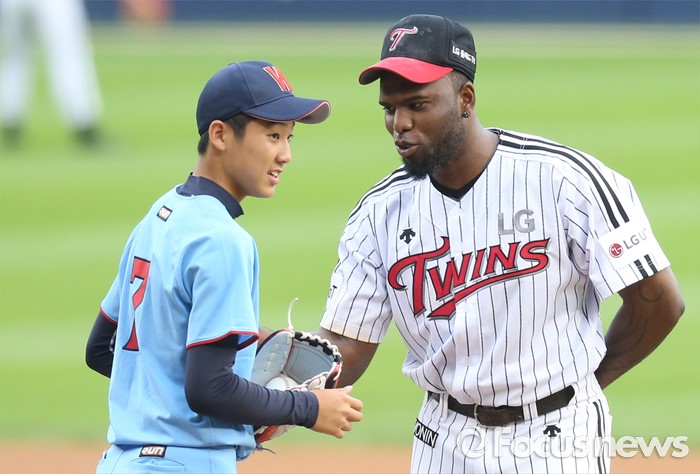 | △ 중학생 투수를 격려하는 헨리 소사 |