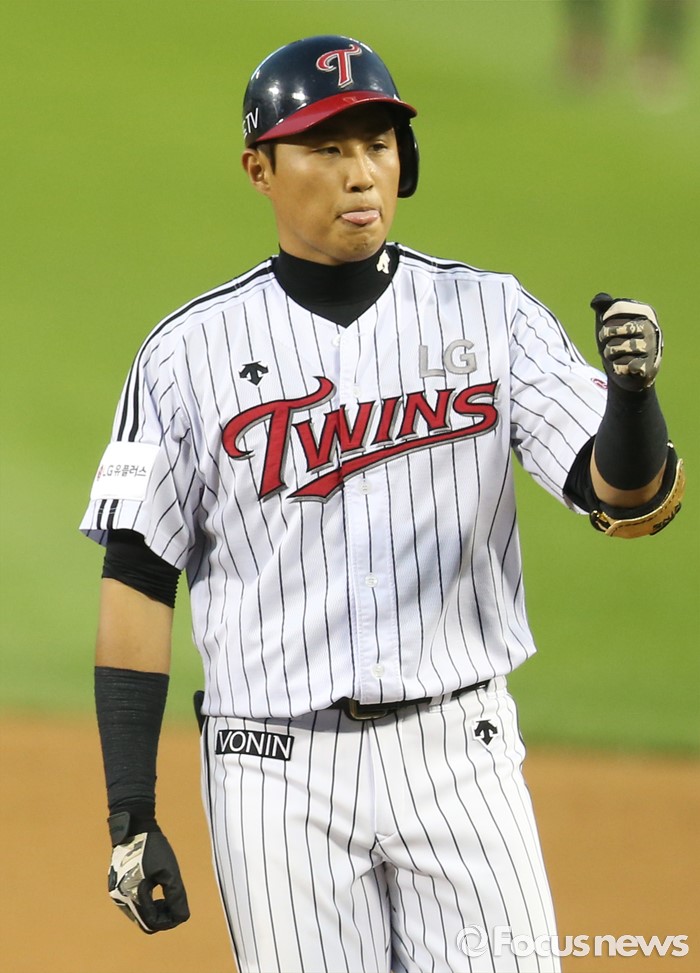 (서울=포커스뉴스) 13일 서울 잠실구장에서 열린 2016 프로야구 한화-LG 경기 4회말 1사 1,2루에서 LG 채은성이 1타점 우중간 안타를 치고 1루에서 기뻐하고 있다.