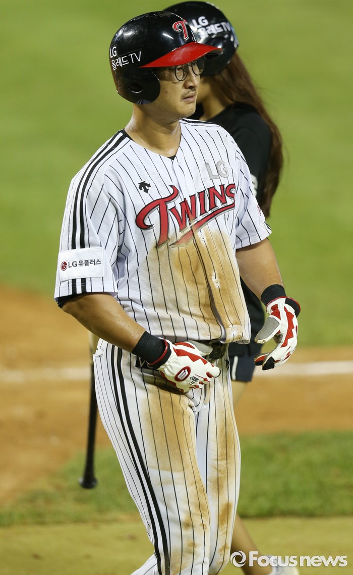 (서울=포커스뉴스) 13일 서울 잠실구장에서 열린 2016 프로야구 한화-LG 경기 7회말 LG 2루주자 박용택이 3루 도루를 성공해 통산 300도루를 기록했다. 박용택이 덕아웃으로 들어가며 옷에 묻은 흙을 털고 있다.