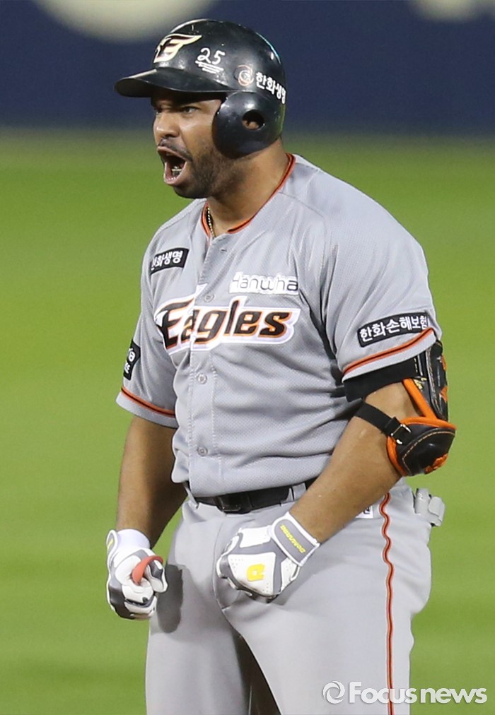 | △ 재역전타 치고 환호하는 한화 로사리오 |