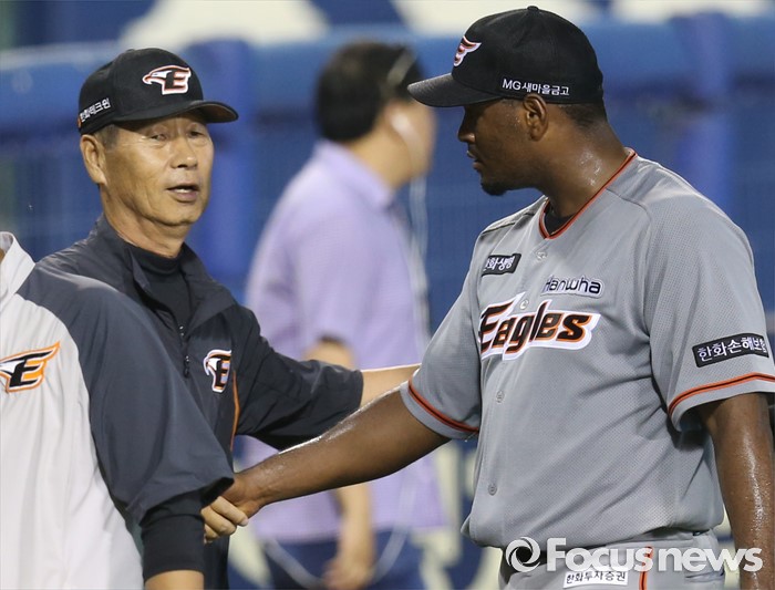 (서울=포커스뉴스) 13일 서울 잠실구장에서 열린 2016 프로야구 한화-LG 경기에서 LG에 재역전승을 한 한화 김성근 감독이 밝은 표정으로 승리투수 카스티요를 맞이하고 있다.