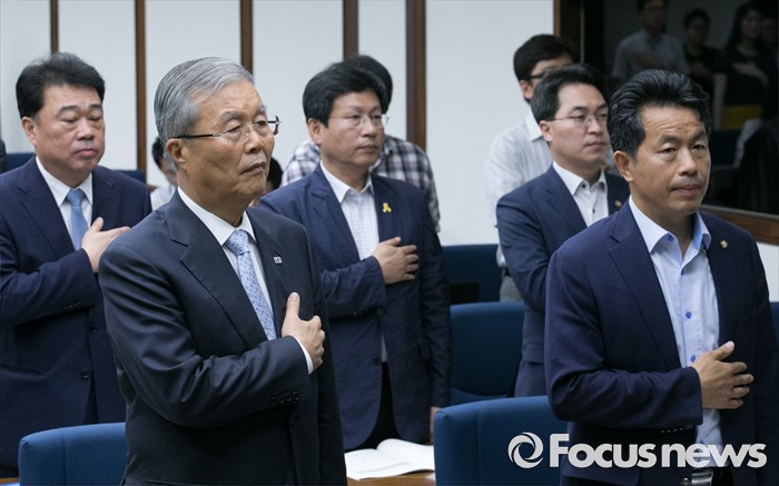(서울=포커스뉴스) 14일 오전 서울 여의도 국회도서관에서 열린 민주적 여론형성을 위한 법제도 개선사항 정책토론회에 참석한 김종인(왼쪽) 더불어민주당 비대위 대표 등 의원들이 국기에 대한 경례를 하고 있다.