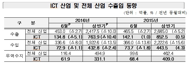 한편 올해 상반기 ICT 수출은 전년 동기대비 10.4% 감소한 763억9000만달러, 수입은 2.4% 감소한 432억8000만달러였다. 무역수지는 331억1000만달러 흑자를 달성했다.6월 ICT 산업 수출입 동향.<표제공=미래부>
