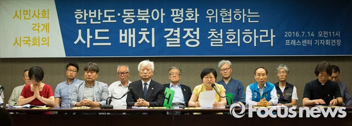 (서울=포커스뉴스) 14일 오전 서울 중구 한국프레스센터에서 시민 사회 각계 인사들이 모여 '한반도, 동북아 평화 위협하는 사드 배치 결정 철회 촉구' 시국회의를 하고 있다.