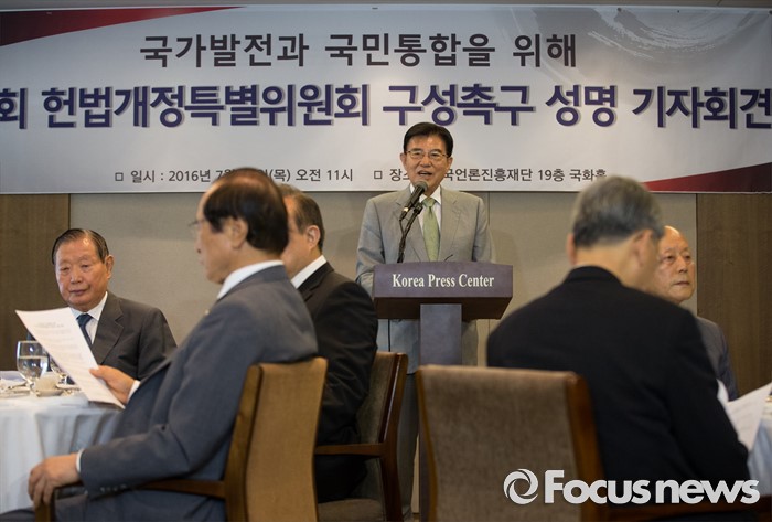 (서울=포커스뉴스) 김덕룡 전 한나라당 원내대표가 16일 오전 서울 중구 프레스센터에서 열린 국회 헌법개정특위 구성 촉구 성명 기자회견에서 발언하고 있다.