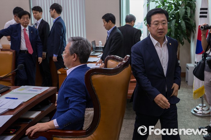 (서울=포커스뉴스) 국회 교육문화체육관광위원회 새누리당 간사 이장우(오른쪽) 의원이 14일 오전 서울 여의도 국회에서 열린 '교육문화체육관광위원회 전체회의'에 참석해 의사진행 발언에 문제를 제기하며 정회된 뒤 회의장을 나서고 있다.