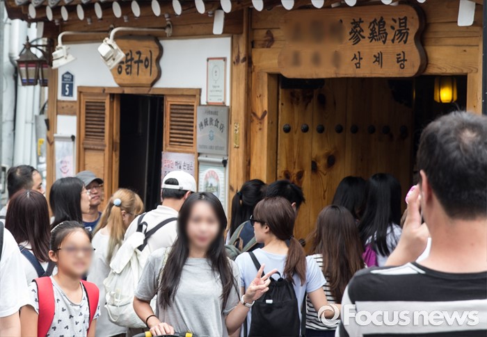 (서울=포커스뉴스) 초복을 사흘 앞둔 14일 오후 서울 종로구에 위치한 한 삼계탕 전문식당을 찾은 시민들이 줄을 서고 있다.