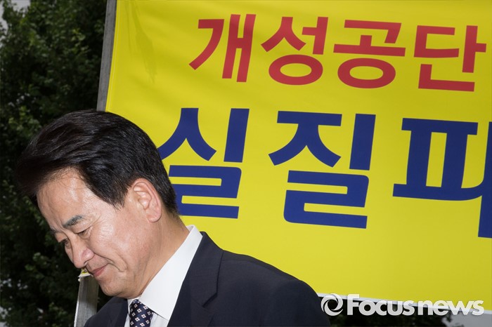 (서울=포커스뉴스) 14일 오후 서울 영등포구 국회의사당역 인근에서 정동영 국민의당 의원이 개성공단 비상대책위원회원들의 실질보상 촉구 집회장을 찾아 격려하고 무대를 내려가고 있다.