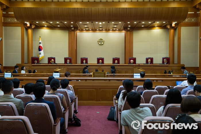 (서울=포커스뉴스) 14일 오후 서울 종로구 헌법재판소 대심판정에서 박한철(가운데) 헌법재판소장이 비례대표 국회의원 후보 공개연설 금지 공개 변론를 위해 자리에 착석해 있다.