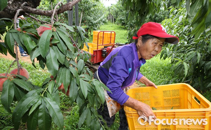 (세종=포커스뉴스) 초복을 사흘 앞둔 14일 세종시 조치원읍 복숭아농장에서 농민이 복숭아를 따고 있다.