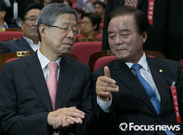 (서울=포커스뉴스) 14일 오후 서울 여의도 국회 의원회관에서 열린 새누리당 전국위원회에 참석한 김희옥(왼쪽) 혁신비대위원장과 정갑윤 전국위의장이 대화하고 있다.