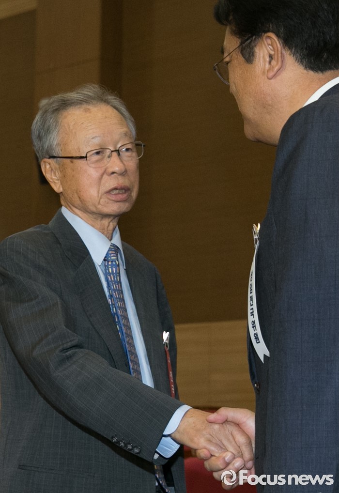 (서울=포커스뉴스) 14일 오후 서울 여의도 국회 의원회관에서 열린 새누리당 전국위원회에 참석한 박희태(왼쪽) 상임고문과 정진석 원내대표가 인사하고 있다.