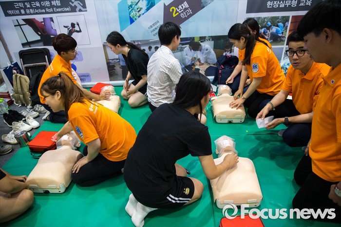 (서울=포커스뉴스) 14일 오후 서울 강남구 코엑스에서 열린 전문대학 엑스포에 참가한 학생들이 심폐소생술을 체험하고 있다.