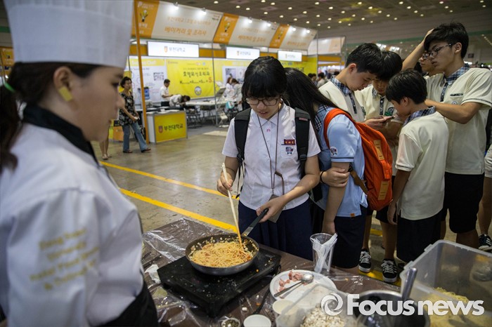 (서울=포커스뉴스) 14일 오후 서울 강남구 코엑스에서 열린 전문대학 엑스포에 참가한 학생들이 스파게티를 만드는 체험을 하고 있다.