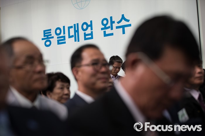 (서울=포커스뉴스) 14일 오후 서울 중구 한국자유총연맹 본부에서 '한국자유총연맹 창립 62주년 기념 통일 선봉대 출범식' 이 열리고 있다. 이날 출범식을 마친 김경재 한국자유총연맹 회장(전 박근혜 대통령 홍보특별보좌관)과 연맹 회원들은 사드 배치를 지지하는 결의 행동을 했다.
