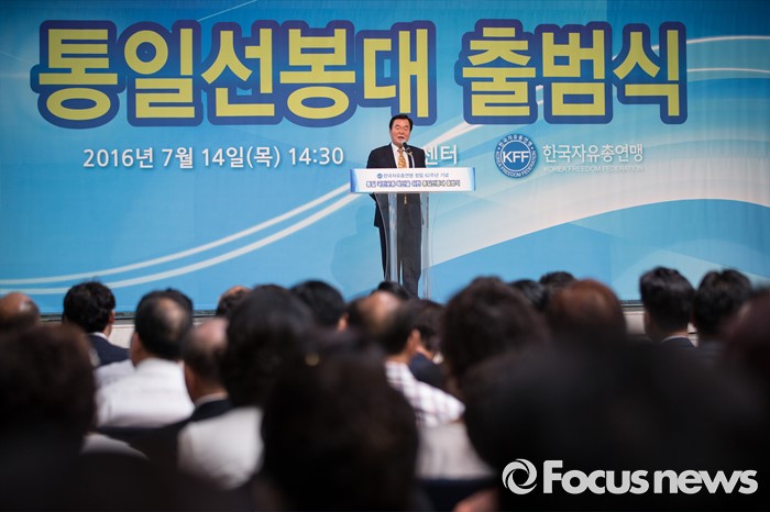 (서울=포커스뉴스) 김경재 한국자유총연맹 회장(전 박근혜 대통령 홍보특별보좌관)이 14일 오후 서울 중구 한국자유총연맹 본부에서 열린 '한국자유총연맹 창립 62주년 기념 통일 선봉대 출범식'에서 사드 배치 지지 발언을 하고 있다.