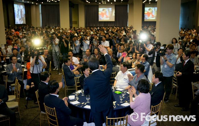 (서울=포커스뉴스) 14일 오후 서울 영등포구 그랜드컨벤션센터에서 열린 당대표 취임 2주년 행사에 참석한 김무성 새누리당 전 대표가 지지자들을 향해 인사하고 있다.