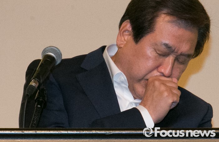 (서울=포커스뉴스) 14일 오후 서울 영등포구 그랜드컨벤션센터에서 열린 당대표 취임 2주년 행사에 참석한 김무성 새누리당 전 대표가 인사말 중 기침을 하고 있다.
