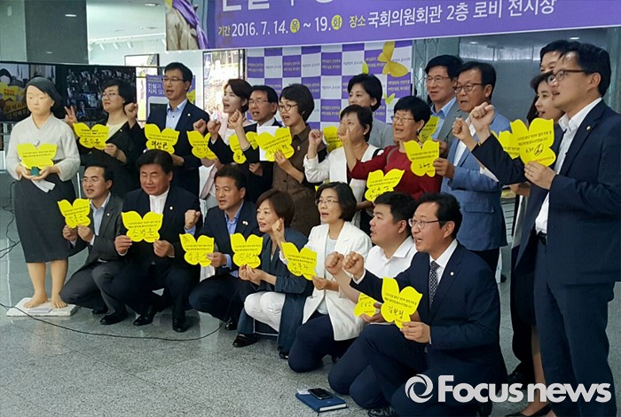 (서울=포커스뉴스)14일 오후 서울 여의도 국회 의원회관에서 열린 12·28 한일합의 무효화와 일본정부의 법적책임이행 촉구를 위한 '진실과 정의는 지지 않습니다' 전시회에 참석한 더불어민주당 의원들이 자신의 이름이 서명된 노란 나비 종이를 들고 포즈를 취하고 있다.
