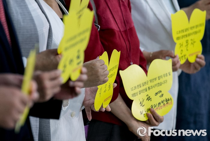 (서울=포커스뉴스) 더불어민주당 소속 심재권 외교통일위원장과 남인순 여성가족위원장 등 의원들이 14일 오후 서울 여의도 국회 의원회관에서 열린 12·28 한일합의 무효화와 일본정부의 법적책임이행 촉구를 위한 '진실과 정의는 지지 않습니다' 전시회에 참석해 본인들이 서명한 노란 나비 종이를 들고 포즈를 취하고 있다.